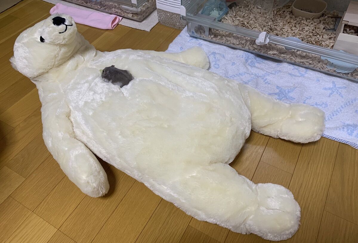 ところが撮れた写真は……飼い主さん曰く「ウルトラマンのカラータイマーみたいになっているハムスター」。写真にはシロクマの胸の部分に「ちょこん」と乗ったおもちくんの姿が写っています。点滅していたら確かにそうみえるかも……。