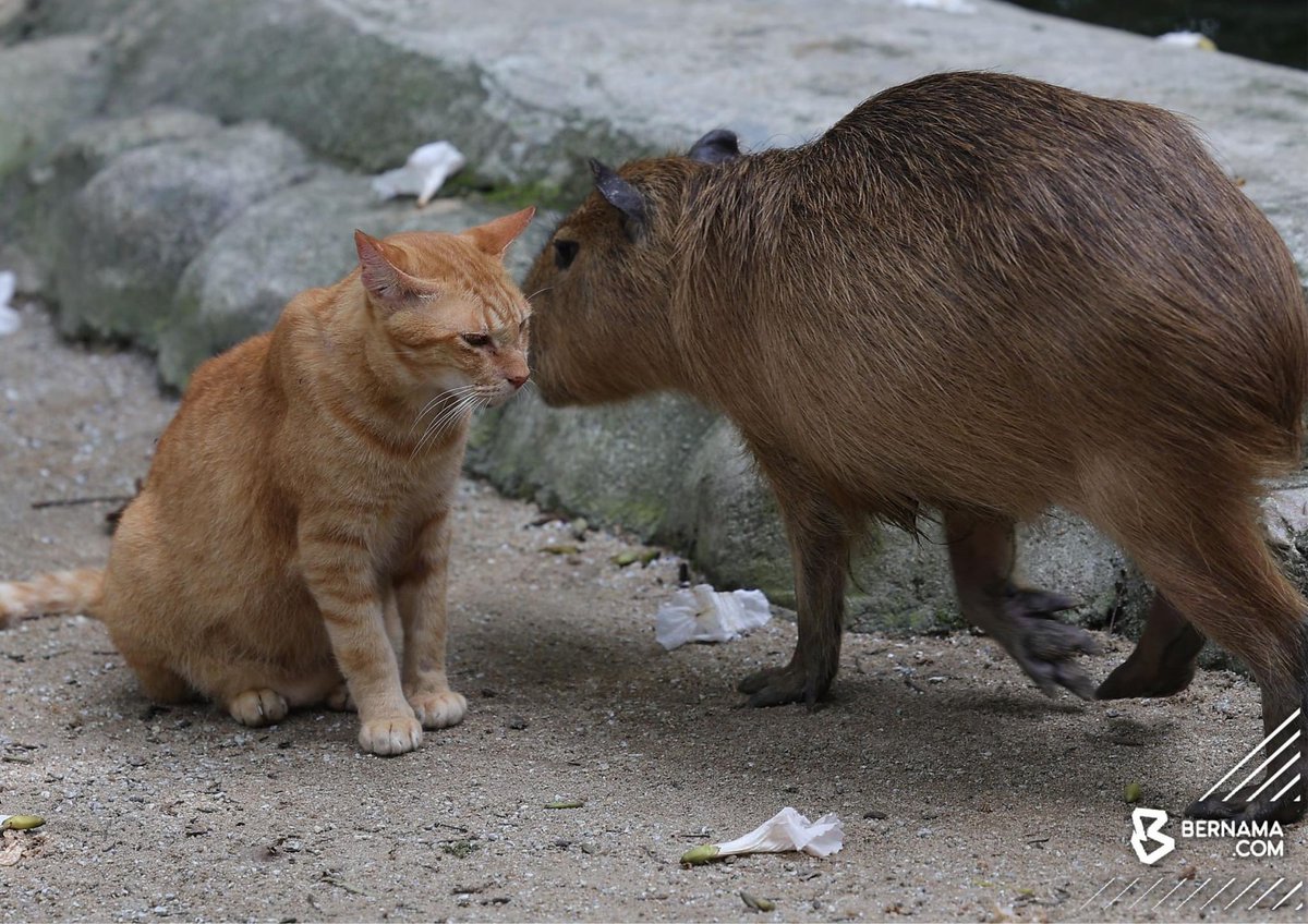 猫が動物園に来た経緯は不明。国営ベルナマ通信によると、新型コロナウイルスの流行を受けて断続的に休園していた動物園が2021年9月、本格的に営業を再開した頃にはカピバラと共存していたという。(略)